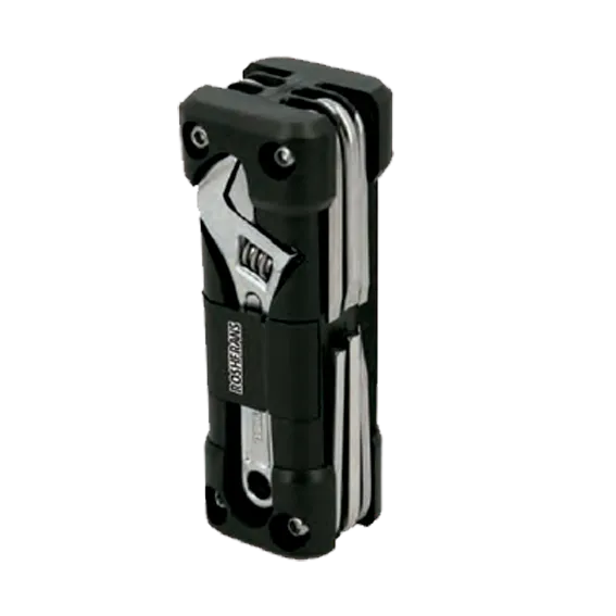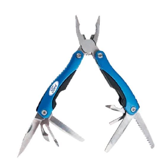 Herramienta plegable con 9 funciones: lima, abre latas, doble destapador, sierra, desarmador de cruz, dos desarmadores planos, navaja, pinzas y seguro de bloqueo. Incluye funda.